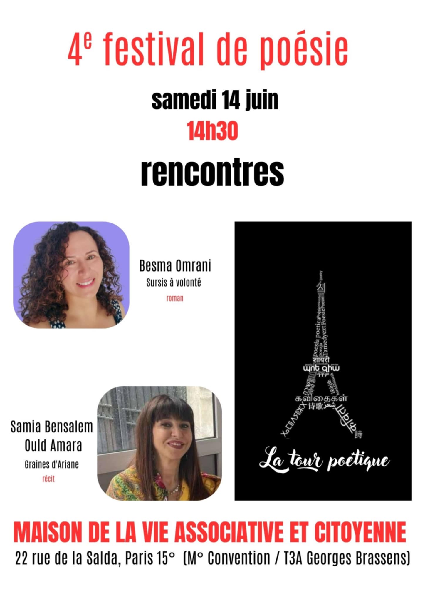 Retrouvez Besma Omrani et son livre "Sursis à volonté" ainsi que Samia Bensalem Ould Amara pour "Graines d'Ariane" au Festival de la Poésie le 14 juin à 14h30 à la Maison de la Vie Associative et Citoyenne.