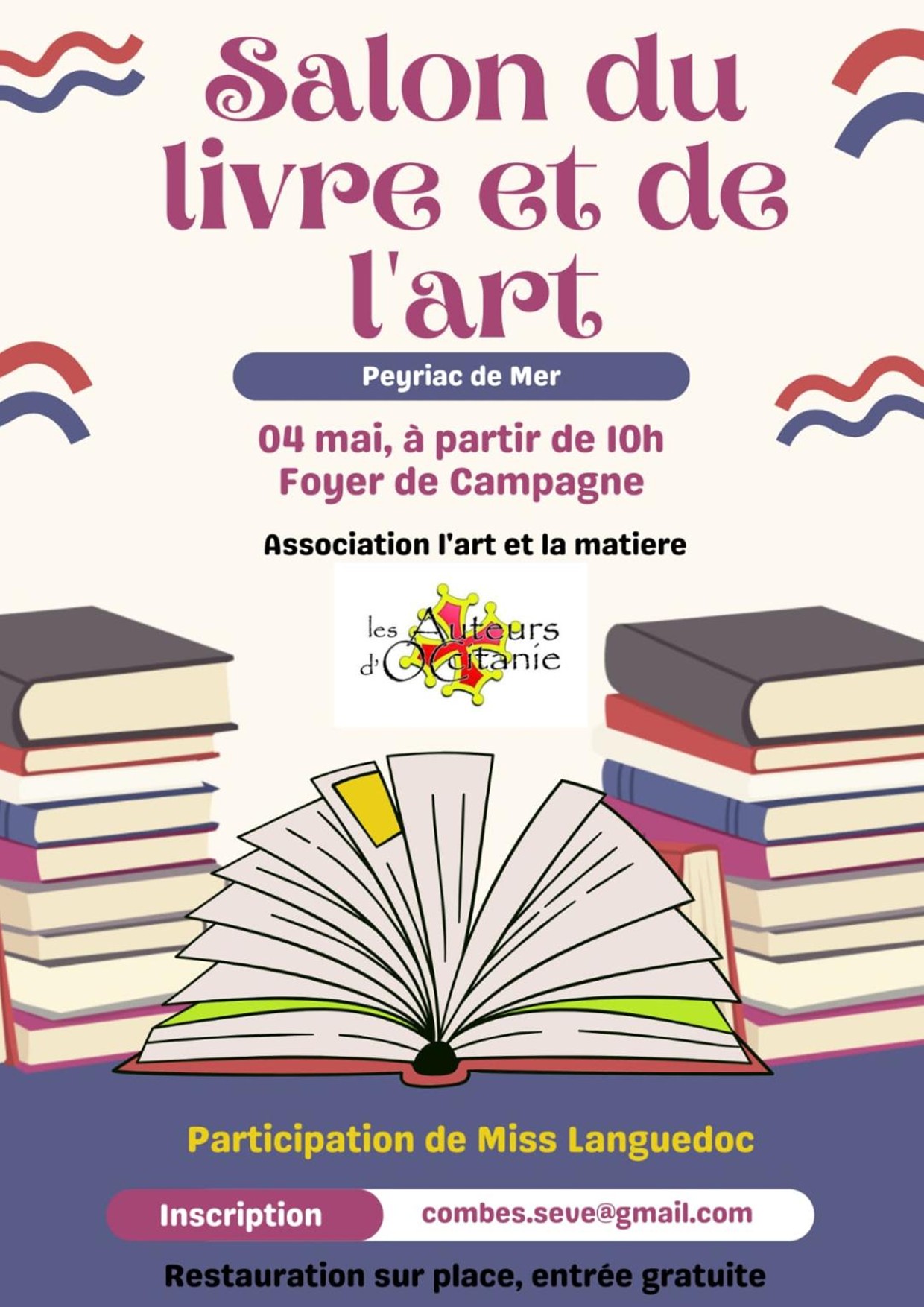 Anne-Claude Iger sera présente au Salon du livre et de l'art le 4 mai à partir de 10h au Foyer des Campagnes de Peyriac-de-Mer.