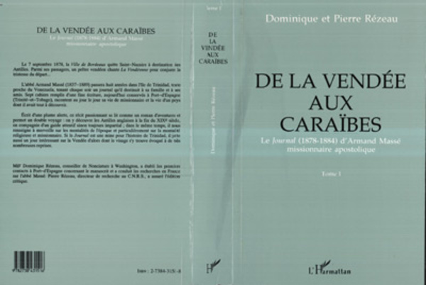 Le 7 septembre 1878, la Ville de Bordeaux quitte Saint-Nazaire à destination des Antilles. Parmi ses passagers, un prêtre vendéen chante La Vendéenne pour conjurer la tristesse du départ... L'abbé Armand Massé (1837 - 1889) passera huit années dans l'île de Trinidad, toute proche du Venezuela, tenant chaque soir un journal qu'il destinait à sa famille et à ses amis. Sept cahiers remplis d'une fine écriture, aujourd'hui conservés à Port-d'Espagne (Trinité-et-Tobago), racontent au jour le jour sa vie de missionnaire et la vie d'un pays dont il avait tout à découvrir. Ecrit d'une plume alerte, ce récit passionnant se lit comme un roman d'aventures et permet un double voyage : on y découvre les Antilles anglaises à la fin du XIXème siècle, en compagnie d'un guide attentif sinon toujours impartial ; dans le même temps, il nous renseigne à merveille sur les mentalités de l'époque et particulièrement sur la mentalité religieuse et missionnaire. Si le Journal est une mine pour l'histoire de Trinidad, il jette aussi un jour intéressant sur la Vendée d'alors dont le visage s'y trouve évoqué à de très nombreuses reprises.