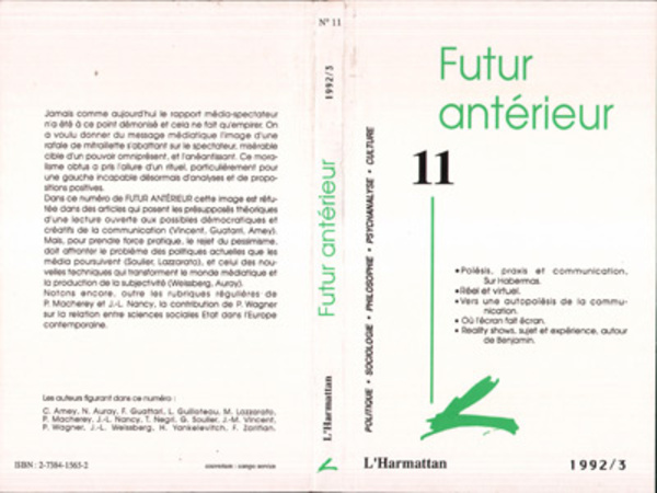 La marche du temps : Infinité de la communication/ finitude du désir (Toni Negri), Du Wategate au nouvel ordre mondial. Naissance de l'information universelle (Gérard Soulier). Articles : Poïesis, praxis et communication. Sur la théorie sociale d'Habermas (Jean Marie Vincent), Réel et virtuel (Jean-Louis Weissberg), Vers une auto poëtique de la communication (Félix Guattari), ""Con !pute !"", ou les formes d'indignation avec l'ordinateur (Nicolas Auray), Où l'écran fait écran. De quelques tendances (Claude Amey), Reality shows : le sujet et l'expérience.Variations sur quelques thémes benjaminiens (Maurizio Lazzarato), Chronique du dinosaure III : La faim de l'histoire (Pierre Macherey), Monogrammes VII (Jean-Luc Nancy), La fin de la grande illusion. Les sciences sociales, la modernité et l'État (Peter Wagner), Qu'est-ce qu'un concept en psychanalyse ? Esquisse d'une logique modale (Hector Yankelevitch). Lectures : Note sur les conflits dans la production culturelle (Maurizio Lazzarato), RMI : un nouveau mode de gestion du travail (Laurent Guilloteau), La communication comme récit partagé (Philippe Zarifian), Juger selon Hannah Arendt (Jean Marie Vincent).