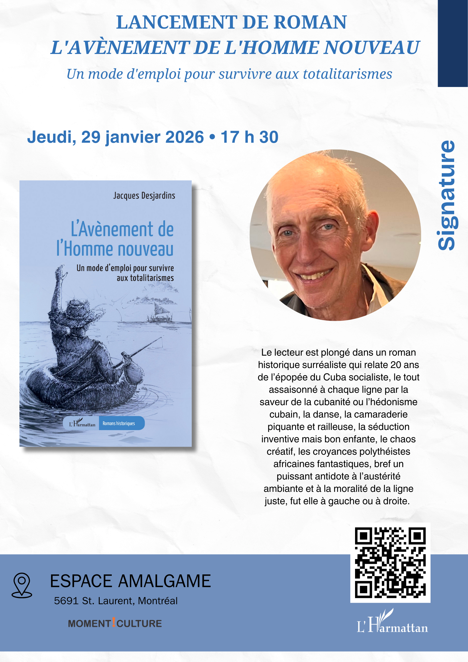 À l’apogée du Cuba socialiste, le récit de vie de Noel – le héros –, révèle un parcours plutôt irrévérencieux. Celui d’un antihéros plus porté sur le carpe diem que sur le Grand Soir des peuples. Son destin picaresque l’entraîne durant deux décennies dans une entreprise aux multiples rebondissements, où on découvre un être forgé dans la spiritualité, un séducteur impénitent, un super-héros adulé, un débrouillard aux mille ressorts. Noel se joue d’un système totalitaire au faciès séduisant, comme de toutes les idéologies étrangères. Et, constamment surgit son ancêtre africain, gardien de la mémoire, contrarié par les distractions existentielles du héros. Ce roman est le fruit d’une passion qui s’amorça lors d’un séjour de travail et d’immersion de deux ans dans une petite ville agricole de la République dominicaine.