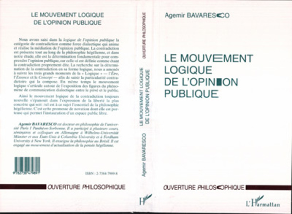Nous avons saisi dans la logique de l'opinion publique la catégorie de contradiction comme force dialectique qui anime et réalise la médiation de l'opinion publique. La recherche sur la détermination de la contradiction en sa forme logique nous a amenés à suivre les trois grands moments de la "" Logique "" - l'Être, l'Essence et le Concept - afin de saisir la particularité contradictoire qui la compose. En même temps le mouvement logique s'articule autour de l'exposition des figures du phénomène...