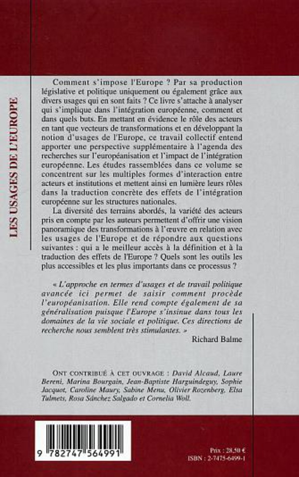 Comment s'impose l'Europe? Par sa production législative et politique uniquement ou également grâce aux divers usages qui en sont faits? Ce livre s'attache à analyser qui s'implique dans l'intégration européenne, comment et dans quels buts. En mettant en évidence le rôle des acteurs en tant que vecteurs de transformations et en développant la notion d'usages de l'Europe, ce travail collectif entend apporter une perspective supplémentaire à l'agenda des recherches sur l'européanisation et l'impact de l'intégration européenne.