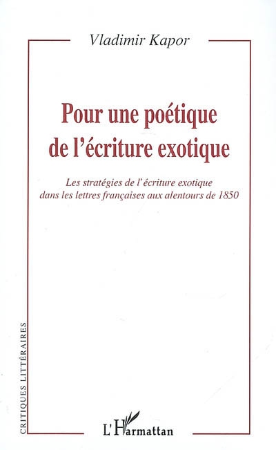 Comment écrire sur une culture étrangère si les moyens linguistiques dont on dispose s'avèrent insuffisants? Comment motiver l'enchaînement des événements sans passer par des codes culturels familiers? L'exotique peut-il être lisible et vraisemblable sans donner dans le stéréotype? Au fil de tels questionnements, cet ouvrage se propose d'évaluer la pertinence de la notion d'écriture exotique, à partir des études de Flaubert, Gautier ou Leconte de Lisle.