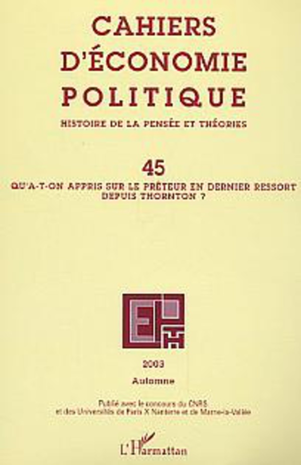 Le thème de ce numéro a été choisi à l'occasion du bicentenaire de l'ouvrage de Henry Thornton. Il ne s'agit pas seulement ici de ""revisiter"" la théorie de Thornton mais aussi d'inscrire la réflexion sur cet auteur au coeur des débats contemporains. En effet, si l'on accorde à reconnaître que Thornton et Bagehot ont posé les bases de la théorie ""classique"" du prêteur ultime et si le débat sur cette doctrine est resté actif jusqu'aux années 1930, il est tombé dans l'oubli pendant un demi sièc...
