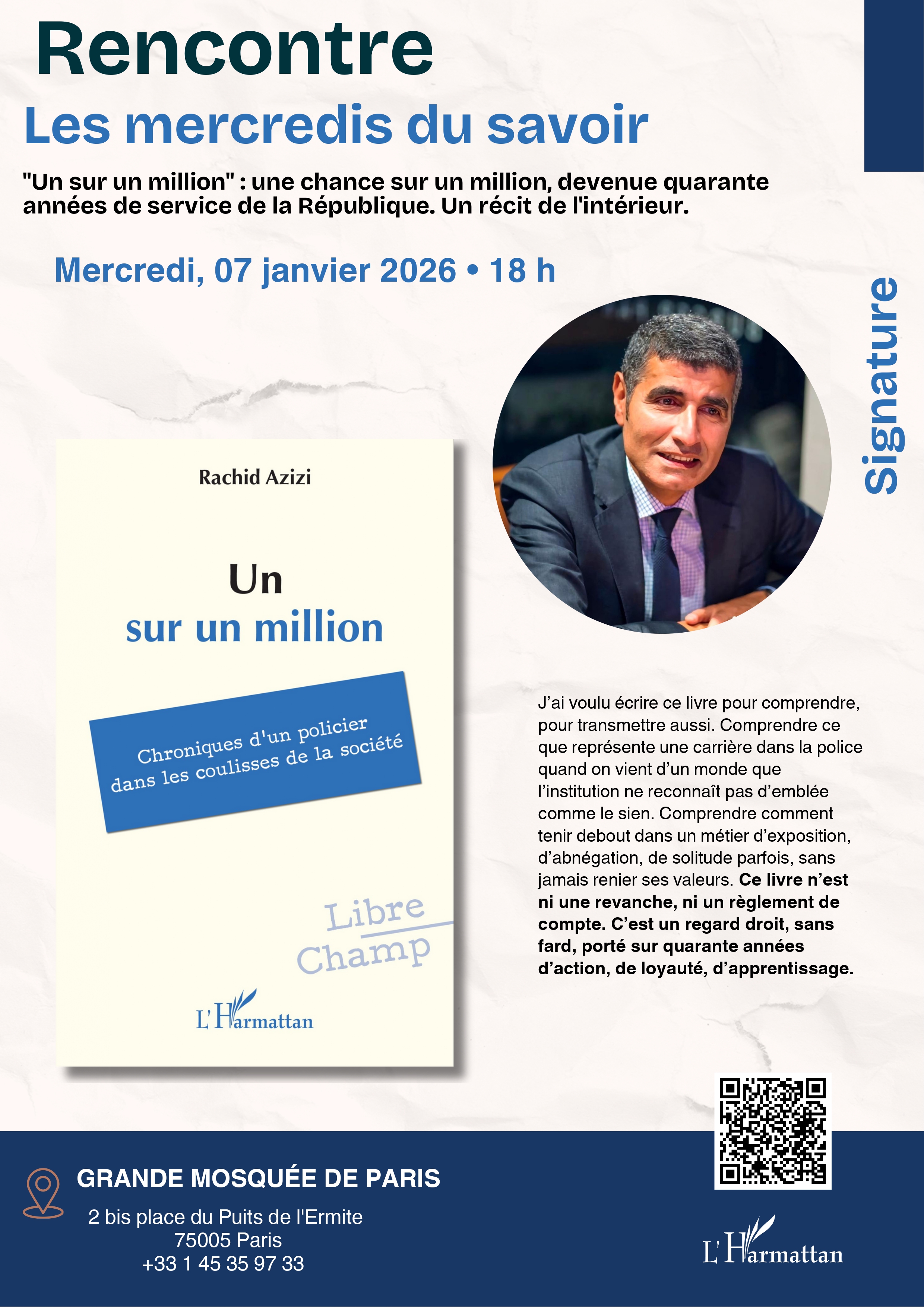On lui disait qu’il n’avait qu’une chance sur un million. Ce « un », c’est Rachid.Enfant de Paris aux racines morvandelles, il entre dans la police par la petite porte, sans piston ni plan de carrière. Pas à pas, il gravit les échelons jusqu’aux plus hautes responsabilités. Il affronte les enquêtes les plus dures, les tensions internes, les regards sceptiques. Il raconte les coulisses d’un métier souvent fantasmé, parfois mal compris. Plus qu’un témoignage, c’est une leçon de persévérance. Celle d’un homme qui a trouvé, dans le service de la République, une dignité et un sens à sa vie. Une histoire qui prouve qu’une seule chance suffit… si on la saisit.